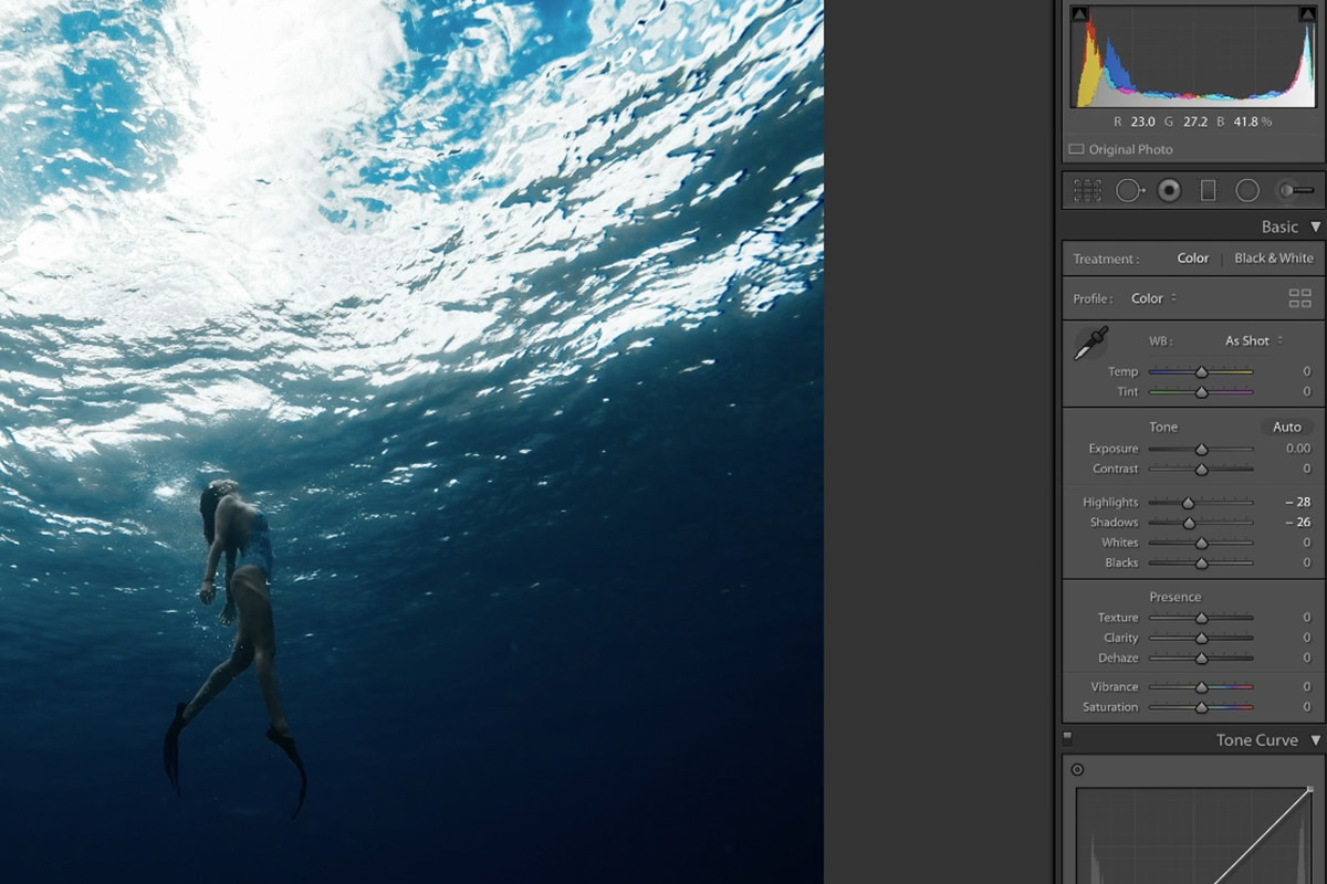 After lowering the highlights we can see a little more of the texture from the water’s surface. All cameras have a limit in dynamic range which prevents them from capturing perfect detail throughout the highlights, midtones, and shadows. But we’re still able to recover some detail, and make overexposed areas a little less distracting.