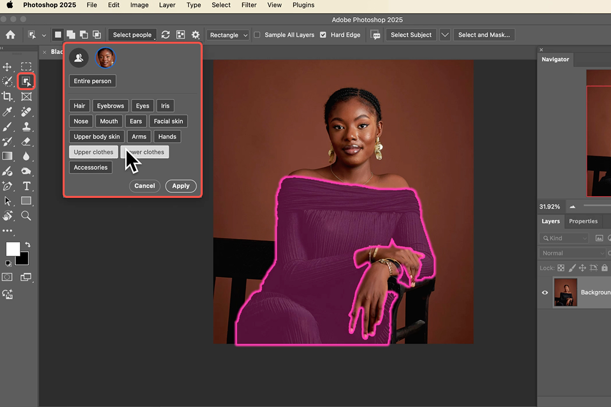2. select the black clothing or object you want to recolor. Use the Object Selection Tool (keyboard shortcut “W”) and leverage its “Select People” feature to quickly isolate the clothing.
