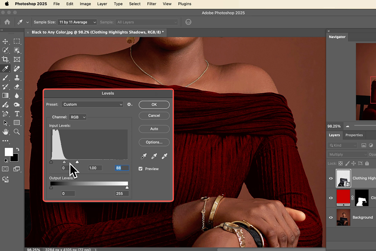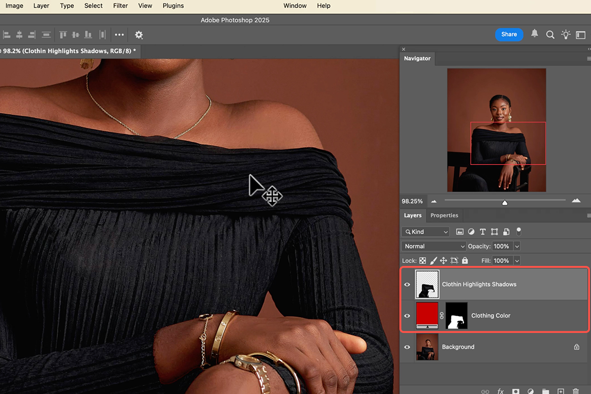 5. Next, extract the highlights and shadows from the original black clothing. Hold Ctrl/Cmd and click on the layer mask of your new color fill layer to reactivate the selection.