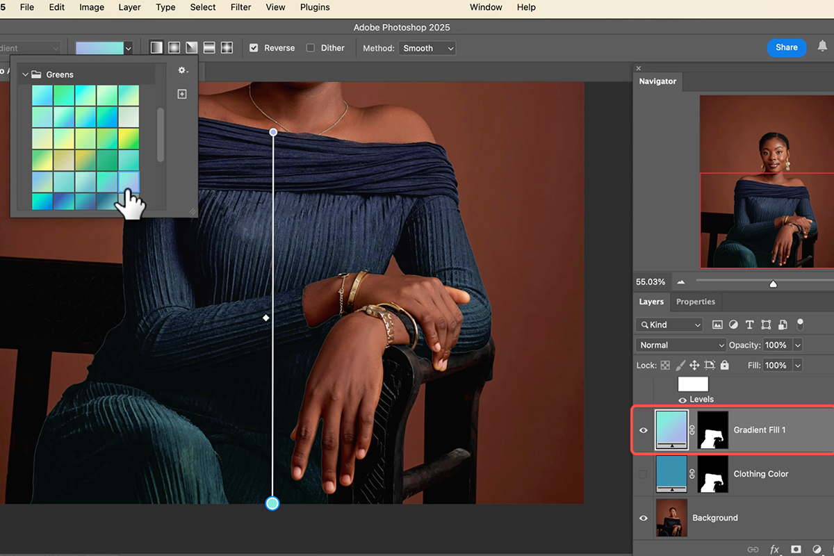 For an even more dynamic look, you can apply a gradient instead of a solid color. To do so, simply create a new Gradient Fill Layer (or switch your Solid Color Fill Layer to a Gradient Fill Layer). Then, hold Alt/Option and click and drag the layer mask from your “clothing color” layer to the new gradient layer. This will copy the mask, allowing the gradient to beautifully fill the shape of the clothing.