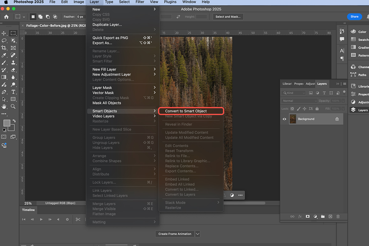 2. To ensure you can always go back and make changes without damaging your original image, convert your background layer to a Smart Object. To do this, go to Layer > Smart Objects > Convert to Smart Object (you can also right click on the layer and select “Convert to Smart Object”). This allows you to apply “Smart Filters” which are non-destructive and fully editable.