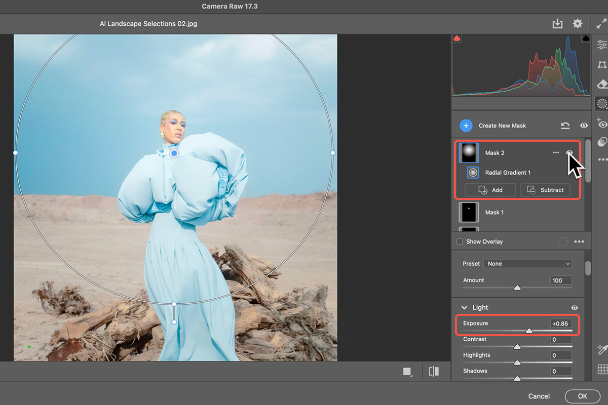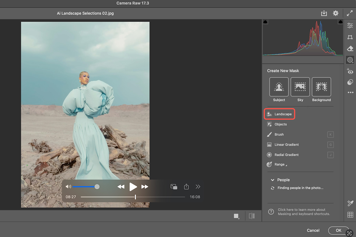 4. In the Camera Raw filter, click on the Masking dialog icon and select the “Landscape” tool.