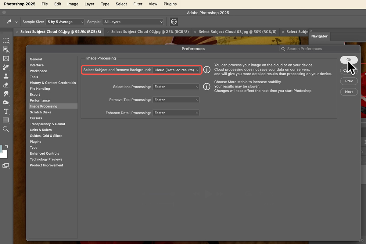 1. Navigate to Photoshop > Settings > Image Processing. Here, you will find options for both “Select Subject” and “Remove Background”.