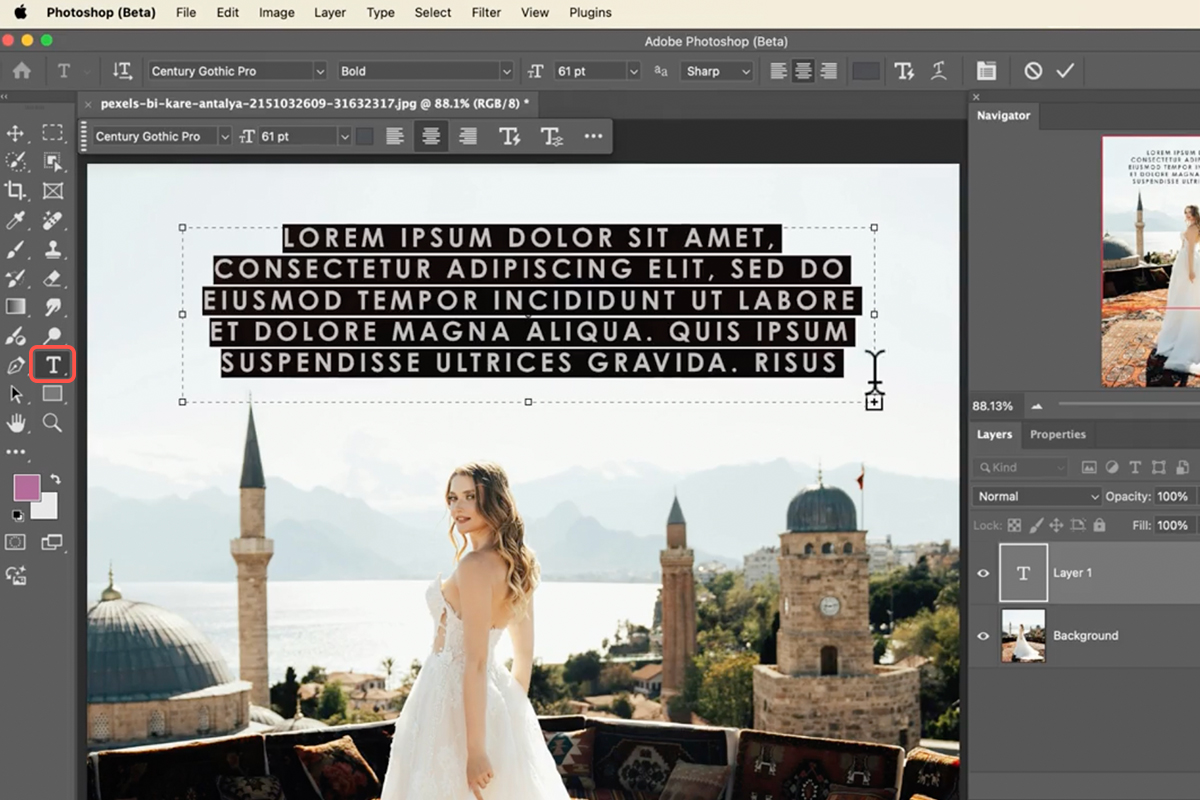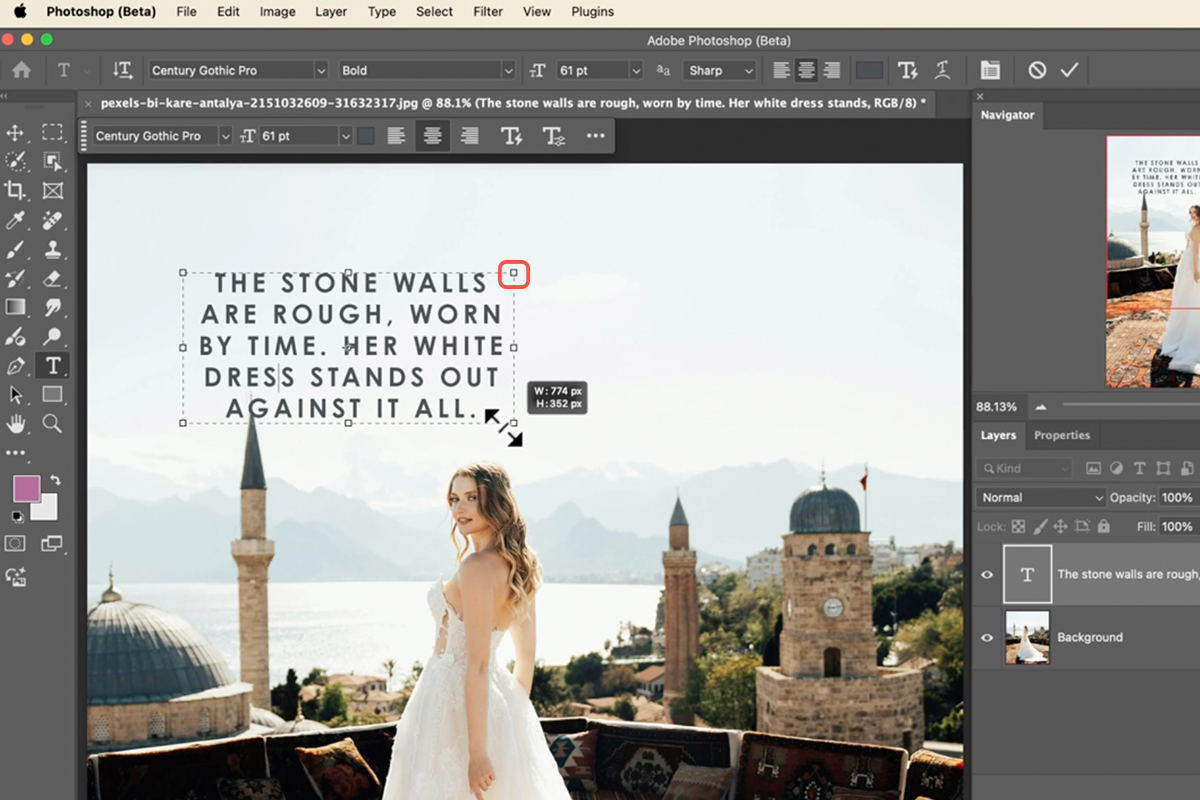 6. To resize the entire text element proportionally after committing the changes, use the Transform Tool (Keyboard Shortcut “Ctrl/Cmd + T”) and hold Alt/Option while dragging a corner to scale from the center, or add Shift to maintain aspect ratio.