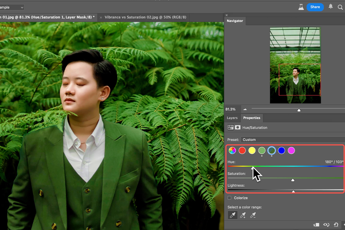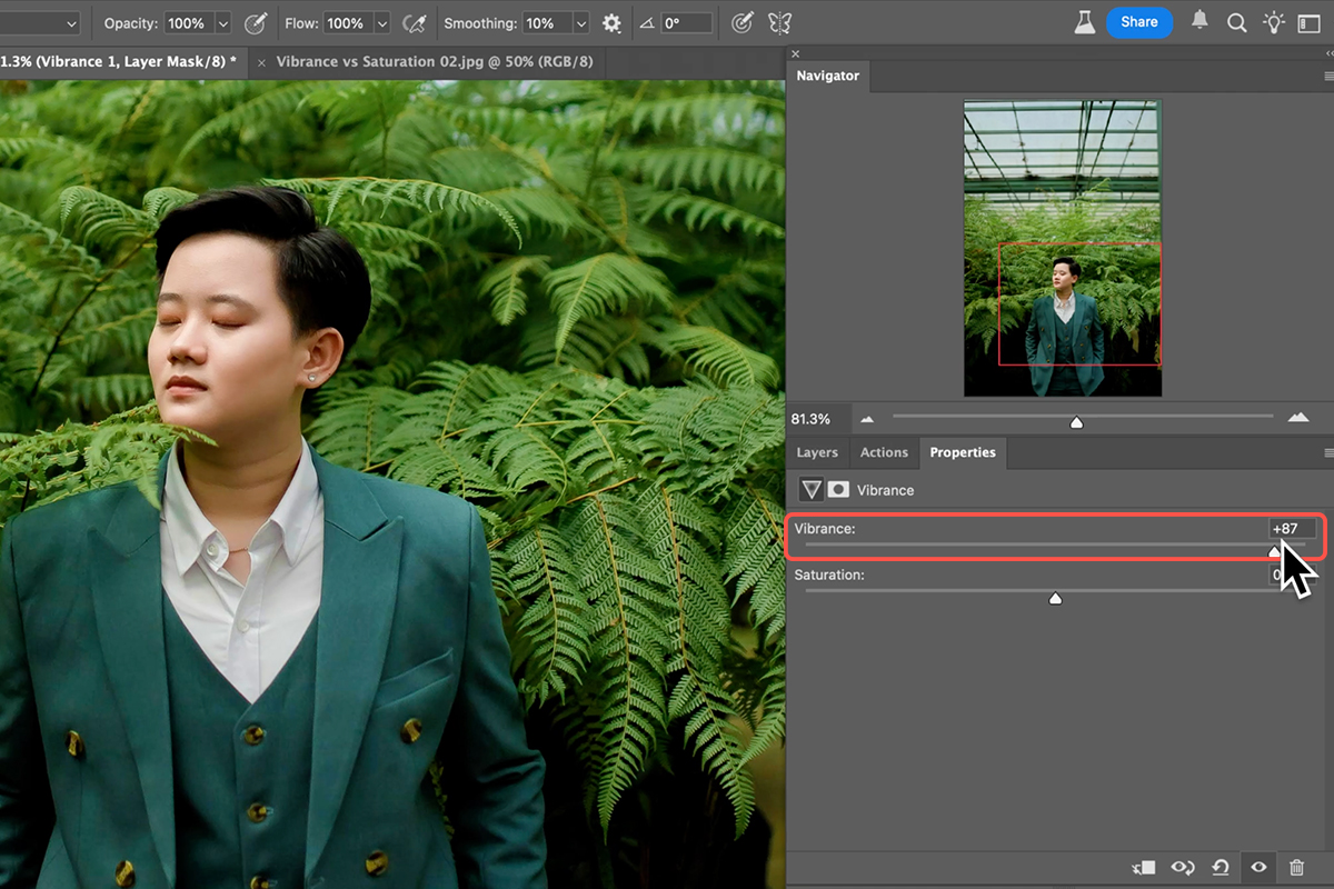 This method is excellent for fine-tuning background colors or specific elements without affecting other parts of your image, like skin tones. This can also be used in conjunction with the overall Vibrance adjustment layer for a comprehensive color enhancement workflow.