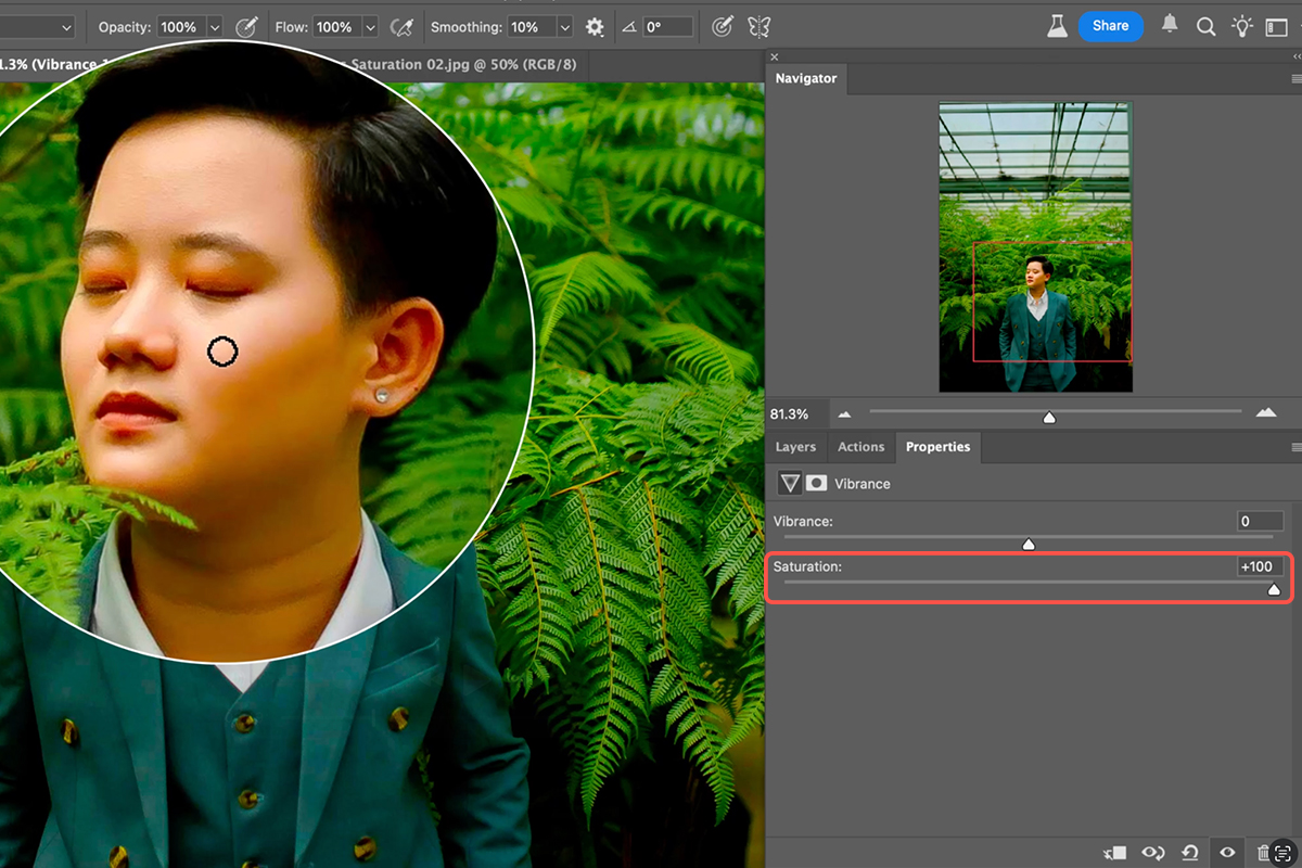 Next, let’s observe the effect of the Saturation slider. While it’s present within the Vibrance adjustment layer, for comparison, you can create a new Vibrance adjustment layer and focus solely on the Saturation slider, dragging it all the way to the right. You’ll see that Saturation boosts all colors equally, often leading to oversaturated skin tones and an unnatural appearance, especially in images with people. This highlights why Vibrance is generally preferred for images containing subjects.