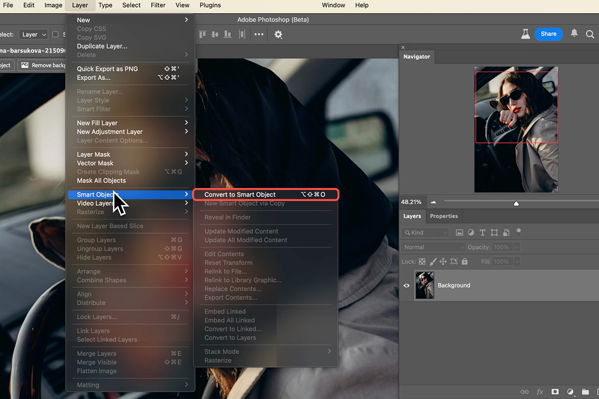 2. To enable flexible, non-destructive editing, convert your background layer into a Smart Object. With your background layer selected, go to Layer > Smart Objects > Convert to Smart Object. You’ll see a Smart Object icon appear on the layer thumbnail, indicating successful conversion.