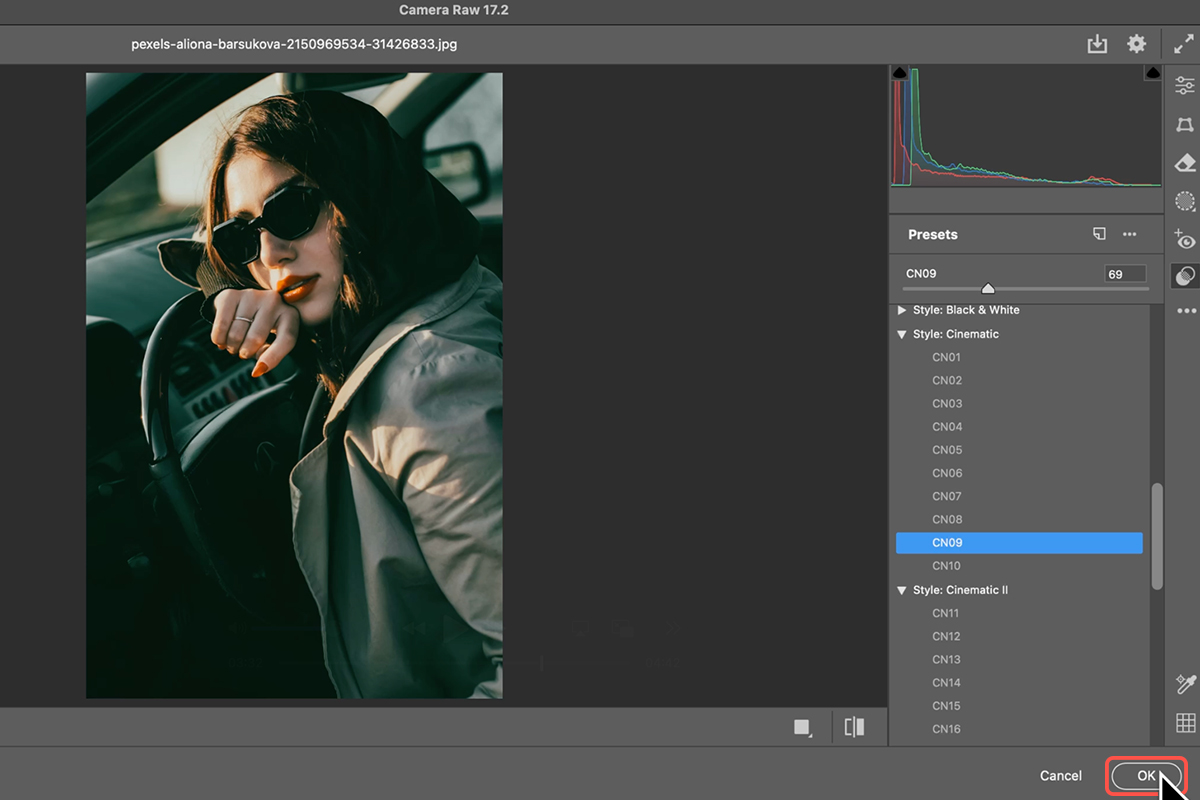 7. After selecting and adjusting your desired preset, click OK in the bottom right corner of the Camera Raw interface. This will apply the color grade as a Smart Filter to your image.